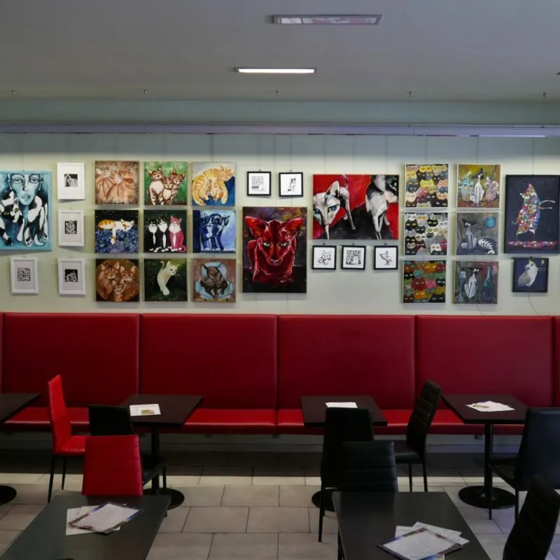 TISKOVÁ ZPRÁVA 2017.08.29 Romana Štrynclová proměnila Cafe&Wine v kočičí galerii Felidae Obrazy koček výtvarnice Romany Štrynclové zaplavily v srp…