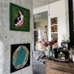 obraz kočky Lili po dobu aukce naleznete v Kavárně Továrna, Vavrečkova 7074, Zlín