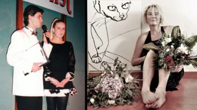 Romana Štrynclová s Alešem Zbořilem v r. 1995 a dnes ve svém ateliéru. _ foto: archiv RŠ