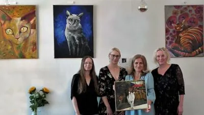 Obraz kočky Evičky se v srpnu podařilo vydražit za 20 tisíc korun. Kmotrou obrazu byla herečka Eva Leinweberová (třetí zleva). _ foto: Simona Polcarová